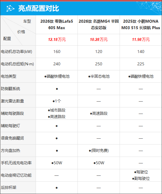 价格方面,2026款名爵MG4的入门车型定价最低,而2025款小鹏MONA M03的顶配车型价格最高。车型数量上三者差异不大,2025款小鹏MONA M03提供4款,2026款零跑Lafa5与2026款名爵MG4均提供5款。